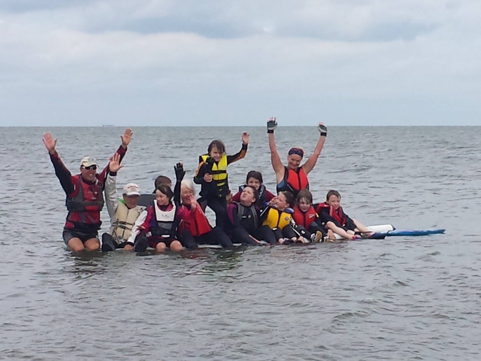 Wednesday 3rd. It may have been too windy for the children to sail but it was still great fun in the water. 5 adults and 17 children enjoyed the day’s activities afloat on whatever they could find, canoes, body boards or dinghies. We tried to sink a Pico dinghy, but with 12 aboard it was still afloat! Thank you to John and Mark in the tower & well done to Bob and Alex for braving 34mph gusts when free sailing.